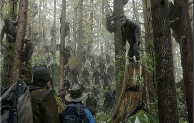 Com tal iniciativa de, primeiramente, ambientar o espectador na sociedade símia, os roteiristas Mark Bomback, Rick Jaffa e Amanda Silver não só criam laços afetivos com os principais personagens dali (o orangotango Maurice é a adição mais inspirada neste filme), como preparam com parcimônia o primeiro encontro com a sociedade humana. Este primeiro contato causa estranheza, elemento indispensável para fazer sentir os anos de falta de convivência entre as espécies. O diretor Reeves filma o encontro com tensão velada, construída por enquadramentos e excelente design de som, o que só favorece a ideia de distanciamento ideológico e social que acometeu as duas partes.